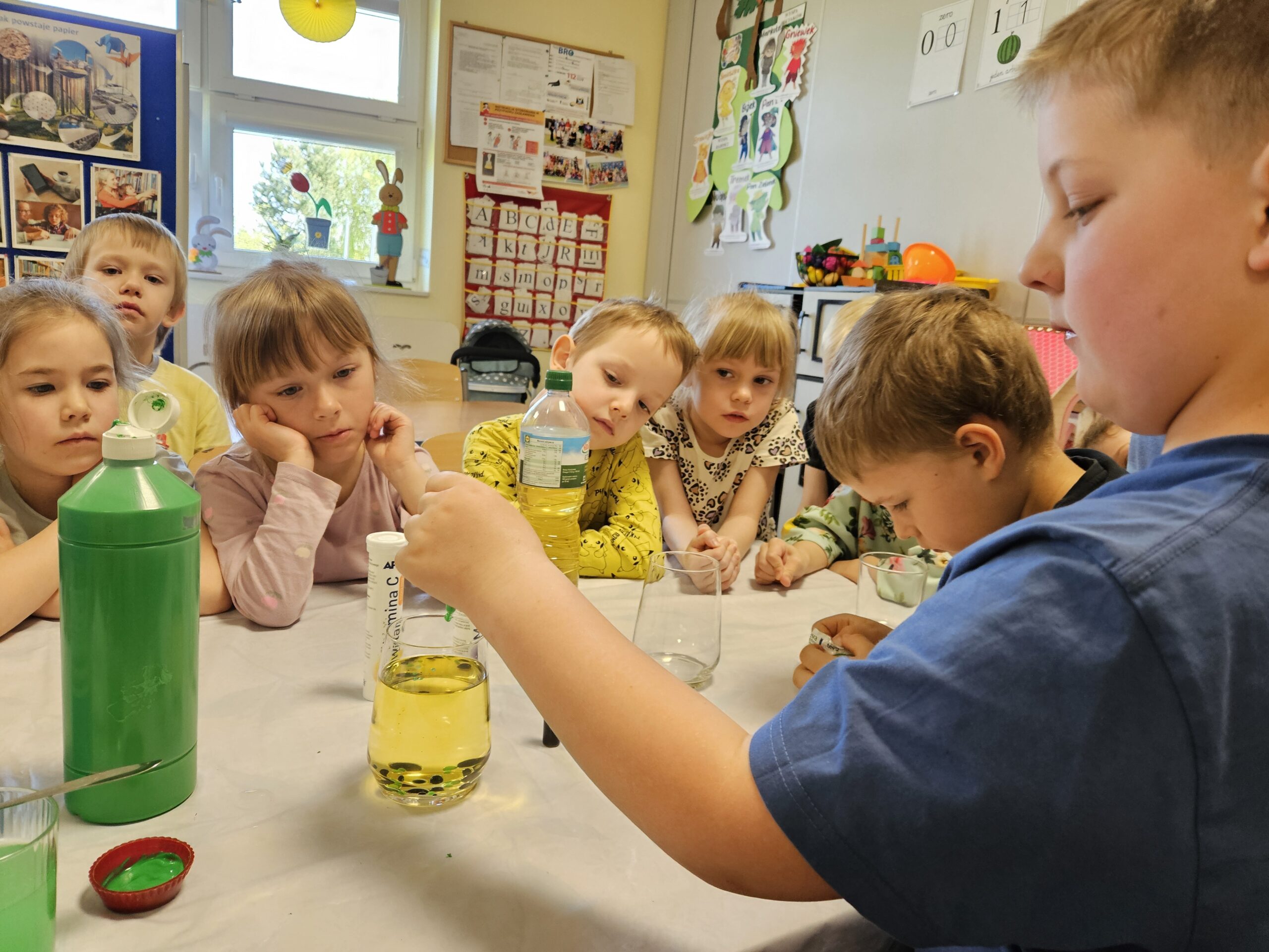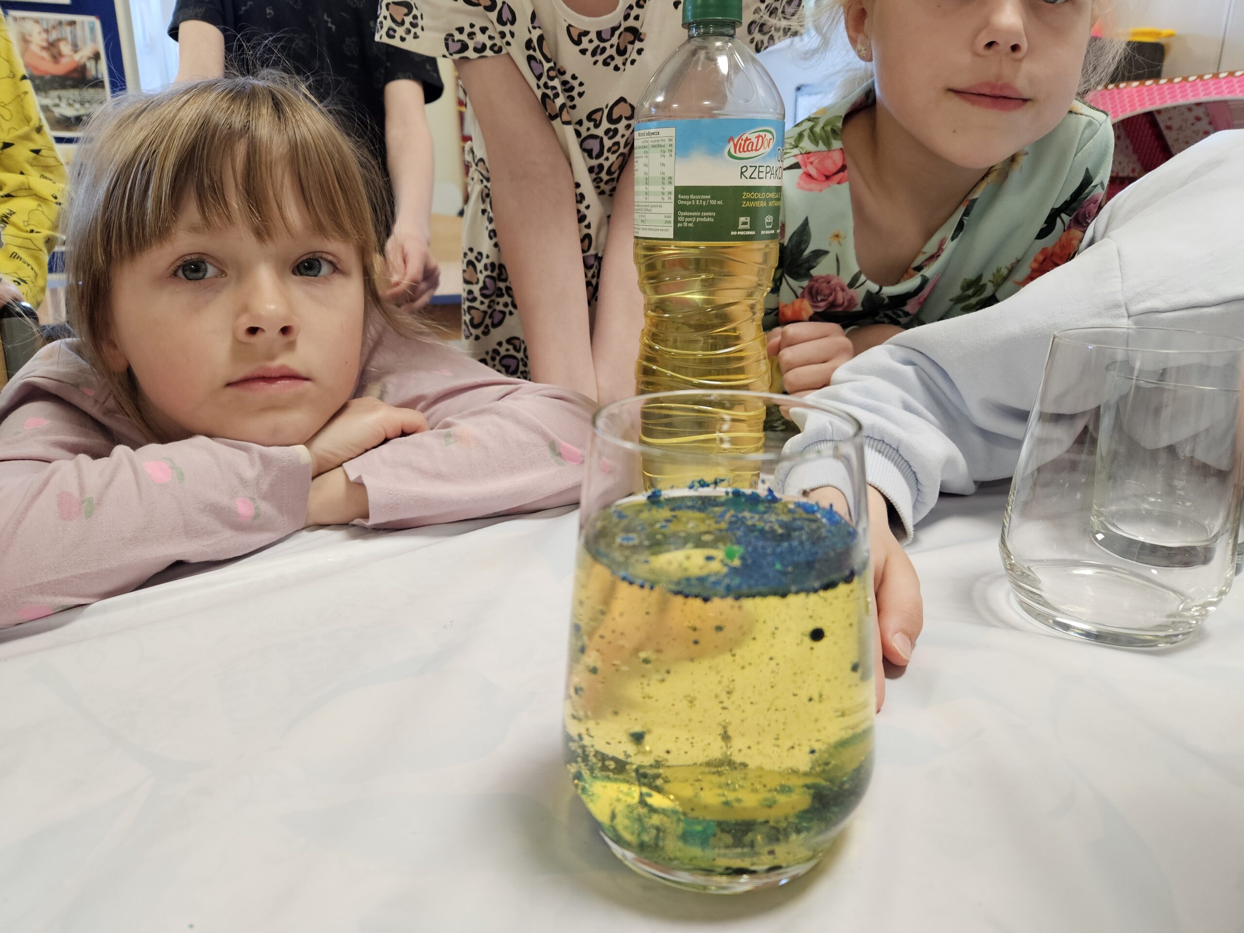 Na zajęciach w ramach „ciekawych popołudni” na dzieci czekała kolejna niespodzianka. Postanowiliśmy zająć się eksperymentem, który można też zrobić samemu w domu. Ten efektowny eksperyment to „Domowa Lampa Lawa”, do którego potrzebne są: Olej, woda, barwniki lub farby w kolorze zielonym i niebieskim, tabletki musujące np. witamina C, calcium lub magnez, kroplomierz i naczynia szklane np. szklanka, słoik itp. Najpierw wlaliśmy wodę i olej do szklanki, później dzieci kroplomierzem dodawały kropelki barwnika i farb do oleju obserwując jak barwnik zachowuje się w oleju. Następnie przedszkolaki wrzucały kolejno tabletki musujące do środka i obserwowały co się stanie. Eksperyment ten jest świetnym sposobem na pokazanie dzieciom, że woda i olej za sobą nie przepadają. Olej zawsze będzie na górze, ponieważ ma mniejszą gęstość niż woda. Kiedy dodaje się barwnik dzieje się coś ciekawego – krople przechodzą przez olej w nienaruszonym stanie, bo barwnik nie rozpuszcza się w tłuszczu i zatrzymują się na granicy warstw lub powoli opadają na dno, gdzie efektownie się rozpuszczają. W momencie dodania tabletki musującej zaczyna się „magia”. Po opadnięciu tabletki na dno zaczyna zachodzić reakcja chemiczna, w wyniku której wydziela się dwutlenek węgla. Gaz tworzy lekkie bąbelki, które „przyklejają się” do cząsteczek zabarwionej wody. Bąbelki gazu są lżejsze od oleju, więc ciągną kolorową wodę ku górze, przebijając się przez warstwę tłuszczu. Wygląda to jak unoszące się zielone i niebieskie kule lawy. Gdy bąbelek gazu dotrze do powierzchni i pęknie, ciężka kropla wody traci swój „balon” i opada z powrotem na dno naczynia. Te zajęcia wywołały wiele emocji, dzieci z zaciekawieniem obserwowały co się dzieje w naczyniu, a przy okazji też wiele się nauczyły z tego eksperymentu.
