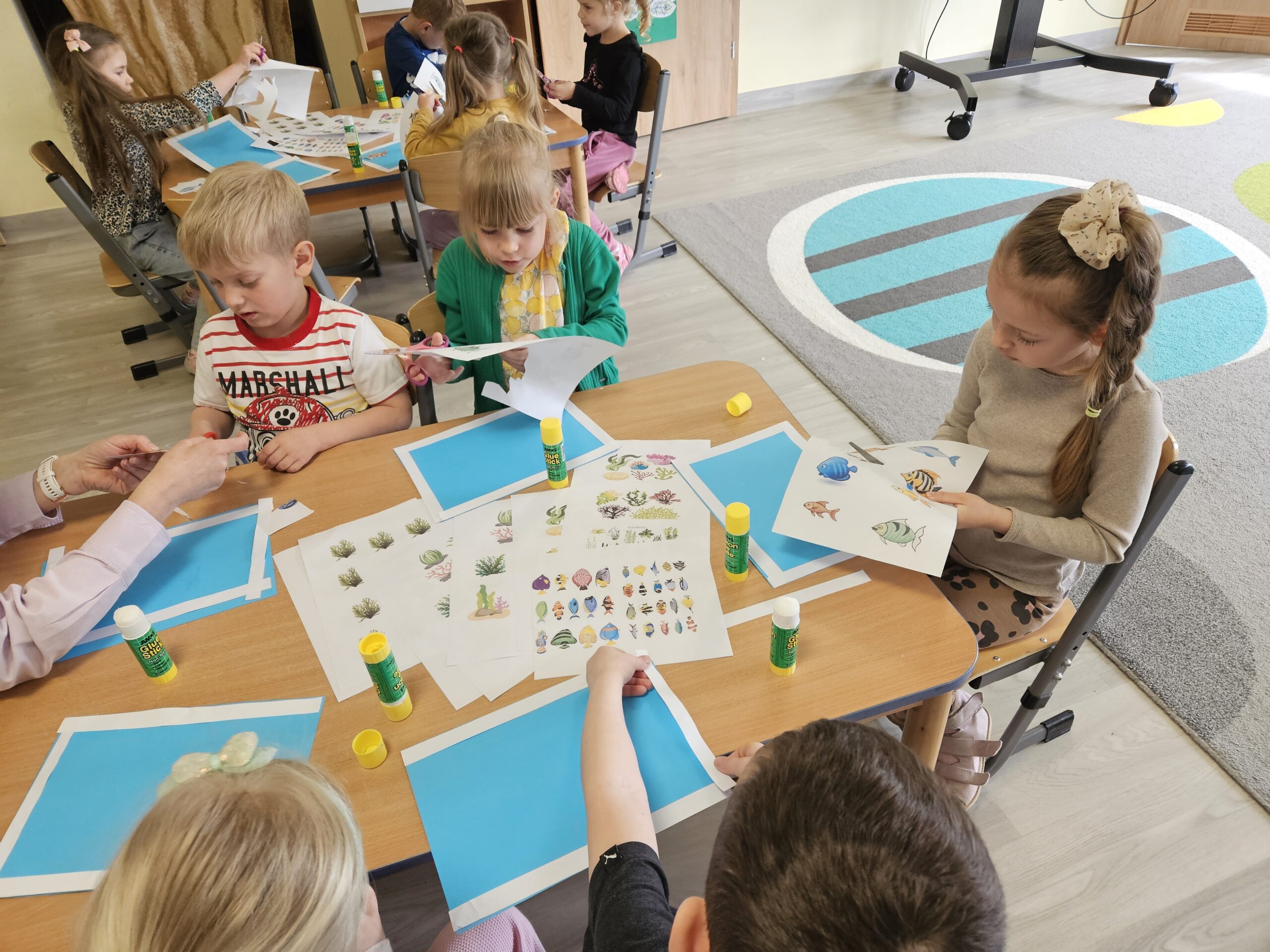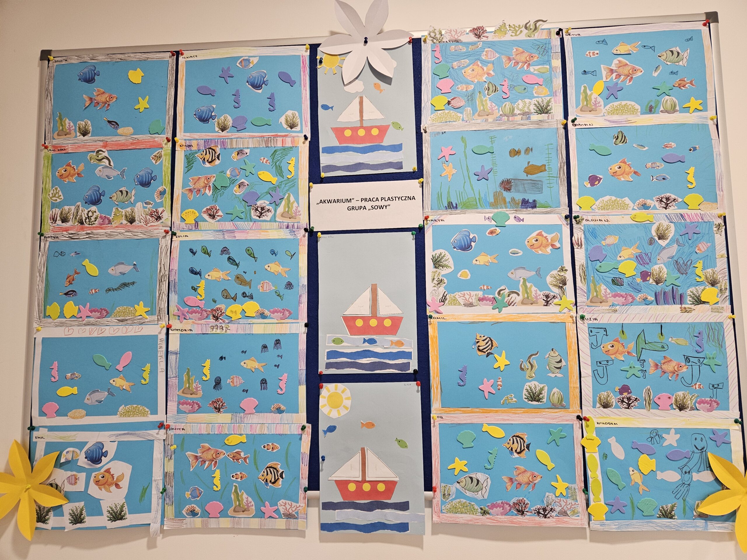 Na kolejnych popołudniowych zajęciach dzieci z grupy „Sowy” wykonały pracę plastyczną związaną z tematem dnia, a sala przedszkolna zamieniła się podwodną krainę. Przedszkolaki oglądały ciekawe książki na temat podwodnego świata, rozmawialiśmy o zwierzętach morskich żyjących pod wodą, gatunkach ryb i roślin. Stąd też zrodził się pomysł, aby każde z dzieci stworzyło na kartkach swoje akwarium. Wykorzystaliśmy do tego niebieskie kartki, białe kartki papieru pocięte w paski do ramki akwarium, kolorowe obrazki rybek i roślin podwodnych, samoprzylepne naklejki zwierzątek morskich i muszli. Najpierw dzieci powycinały kolorowe rybki z papieru – te, które im się najbardziej podobały, przykleiły też „piankowe” zwierzątka i roślinki morskie, a później same ozdobiły ramkę akwarium przy pomocy kredek i flamastrów oraz dorysowały swoje rybki i rośliny według własnego pomysłu. Trzeba przyznać, że to zajęcie sprawiło przedszkolakom ogromną radość. Niektóre z dzieci posiadają akwarium w domu, dlatego w tej pracy zadziałała wyobraźnia. Dzieci się nie nudziły, panowała miła atmosfera i dzieci wykazały się kreatywnością. Miło było popatrzeć, jak przebiegała współpraca w grupie podczas tego zajęcia, jak dzieci bez kłótni dzieliły się ze sobą wyciętymi elementami i wymieniały między sobą pomysłami. Tworzenie papierowych akwariów było doskonałym ćwiczeniem motoryki małej. Poprzez precyzyjne wycinanie skomplikowanych kształtów ryb i roślin, dzieci doskonaliły chwyt nożyczek i koordynację wzrokowo-ruchową. Proces planowania przestrzeni na kartce pozwolił im rozwinąć wyobraźnię oraz zmysł kompozycyjny, a efekt końcowy przyniósł mnóstwo radości i satysfakcji.