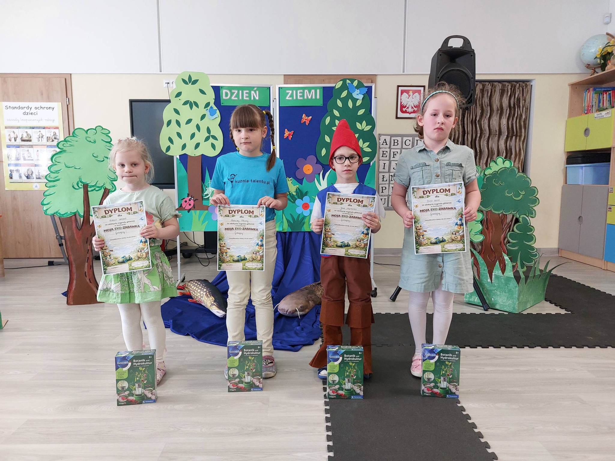 W dniach od 17 marca 2026 r. do 15 kwietnia 2026 r. odbył się w naszym przedszkolu konkurs plastyczny pt. „Moja eko-zabawka”. Zainteresowanie konkursem przerosło nasze najśmielsze oczekiwania, co jest dla nas ogromną radością i motywacją do organizowania kolejnych inicjatyw. Był to konkurs rodzinny, a zadanie konkursowe polegało na własnoręcznym wykonaniu zabawki z materiałów wtórnych. Celami konkursu było rozbudzenie twórczości i wyobraźni u dzieci, podnoszenie świadomości ekologicznej oraz zachęcenie do wspólnego spędzania czasu w kreatywny sposób. Na konkurs dotarło aż 57 prac. Z radością podziwialiśmy wiele pięknych i pomysłowych zabawek, które zachwyciły nas swoją różnorodnością i starannością wykonania. Każda zabawka była wyjątkowa i pokazywała, jak wielki potencjał tkwi w połączeniu wyobraźni dzieci i wsparciu dorosłych. Wśród prac pojawił się funkcjonalny wózek dla lalek, który jeździł, a także imponujący czołg wykonany z dbałością o detale. Duże zainteresowanie wzbudziły misternie wykonane domki dla lalek, zachwycające swoją starannością i pomysłowością. Nie zabrakło również nowoczesnych projektów, takich jak laptop z kablem oraz różnego rodzaju robotów i rakiet, które przenosiły nas w świat wyobraźni i przyszłości. Dzieci wykazały się także praktycznym podejściem, tworząc piętrowe garaże i parkingi dla samochodów, jak również kuchenkę do zabawy w dom. Wśród bardziej przytulnych projektów znalazł się kotek w legowisku z drapakiem, który skradł serca wielu oglądających. Do wykonania wszystkich prac wykorzystano materiały wtórne, takie jak zakrętki, kartony, plastikowe butelki, opakowania po kosmetykach, odpady drzewne, folie czy gazety. Dzięki temu dzieci nie tylko rozwijały swoją wyobraźnię i zdolności manualne, ale także uczyły się, jak ważna jest troska o środowisko i ponowne wykorzystywanie surowców. Komisja miała nie lada trudność w wyborze głównych miejsc. Spośród wszystkich prac wyłoniono 4 główne miejsca, które przypadły: Janowi S., Aurelii U., Oliwii Dz. oraz Aleksandrze P. Przyznano także 6 wyróżnień, które otrzymali: Wiktoria S., Maksymilian R., Jan K., Jakub K., Milena H. oraz Iga Ż. Nagrody oraz pamiątkowe dyplomy dla wszystkich uczestników zostały wręczone 22.04.2026 r. w trakcie obchodów Dnia Ziemi w naszym przedszkolu. Natomiast wszystkie prace mogliśmy podziwiać podczas wystawy urządzonej w przedszkolnym korytarzu. Serdeczne podziękowania należą się rodzicom za tak liczny udział w konkursie, kreatywność oraz serce włożone w przygotowanie prac! Szczególnie doceniliśmy czas spędzony wspólnie przez całe rodziny podczas tworzenia tych niezwykłych projektów. To właśnie te chwile współpracy, rozmów i wspólnej zabawy mają największą wartość. Konkurs „Moja EKO-ZABAWKA” pokazał wszystkim, że ekologia może iść w parze z doskonałą zabawą, a kreatywność rodziców i dzieci nie zna granic.