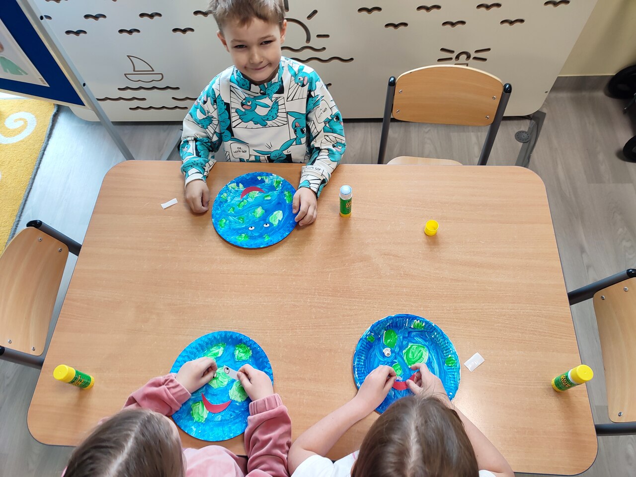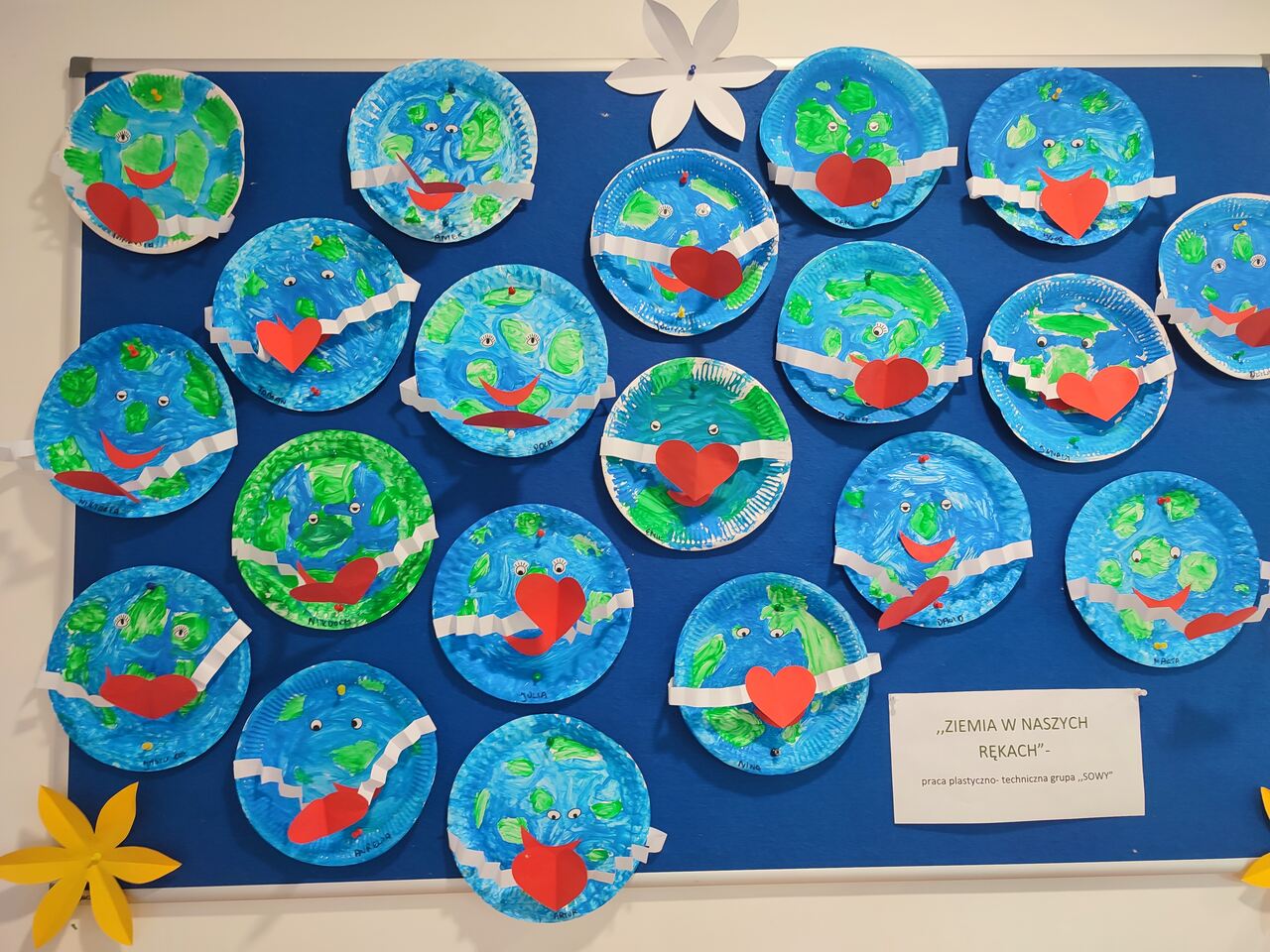Dzieci z grupy „Sowy” podczas zajęć z cyklu „Ciekawe popołudnia” wykonały pracę plastyczną przedstawiającą planetę Ziemię. Każde dziecko otrzymało papierowy talerzyk, który pomalowało, zaznaczając morza i oceany kolorem niebieskim oraz lądy kolorem zielonym. Następnie dzieci wycinały z białych kartek paski papieru i składały je w harmonijkę. Z czerwonego papieru wycięły serca. Powstałe harmonijki zostały przyklejone do Ziemi, tworząc efekt trójwymiarowych rąk, do których dzieci przymocowały serca. Na zakończenie prace zostały ozdobione samoprzylepnymi oczkami oraz buziami.