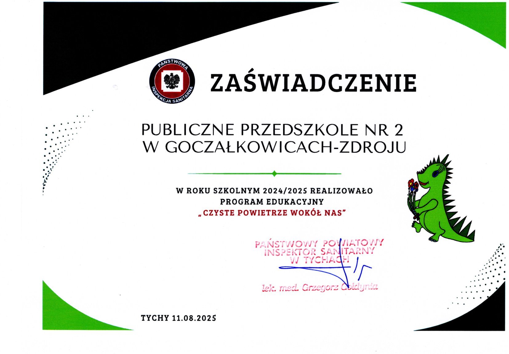 Podziękowanie za udział w akcji „Czysty aniołek”. |  Dyplom za udział w akcji „Szkoła Pamięta”. |  Nominacja do tytułu Przedszkole Roku 2024 |