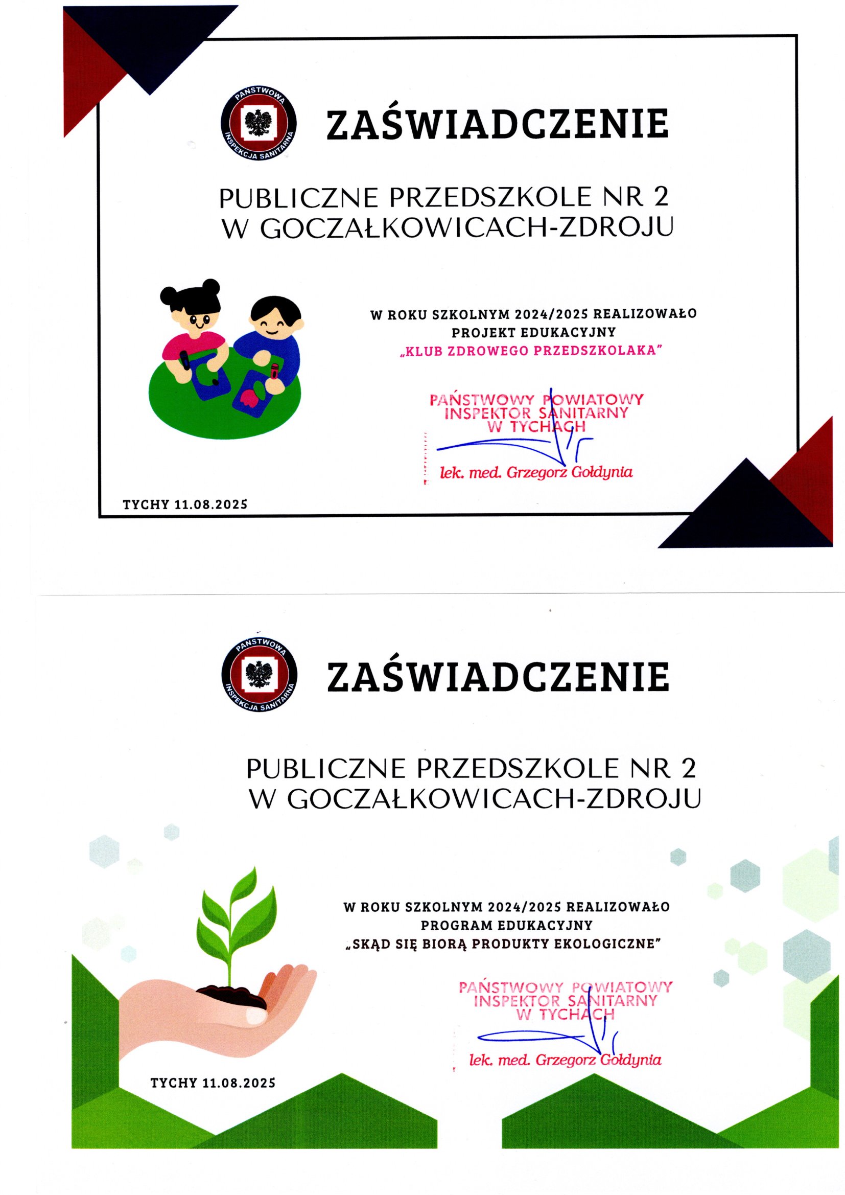 Dyplom za udział w akcji „Szkoła do hymnu”. |  Podziękowanie dla pracowników Publicznego Przedszkole nr 2. |  Dyplom przyznania „Nagrody specjalnej”. |